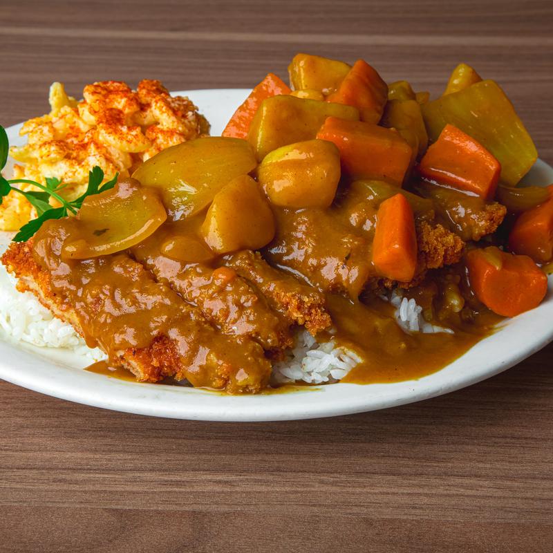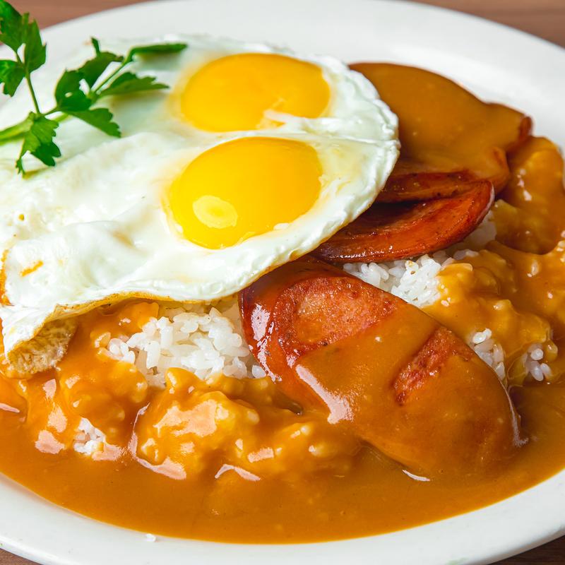 Housemade hamburger, spam, chicken katsu, or Portuguese sausage served on steamed rice topped with 2 eggs & brown gravy (sub fried rice +$2.50).