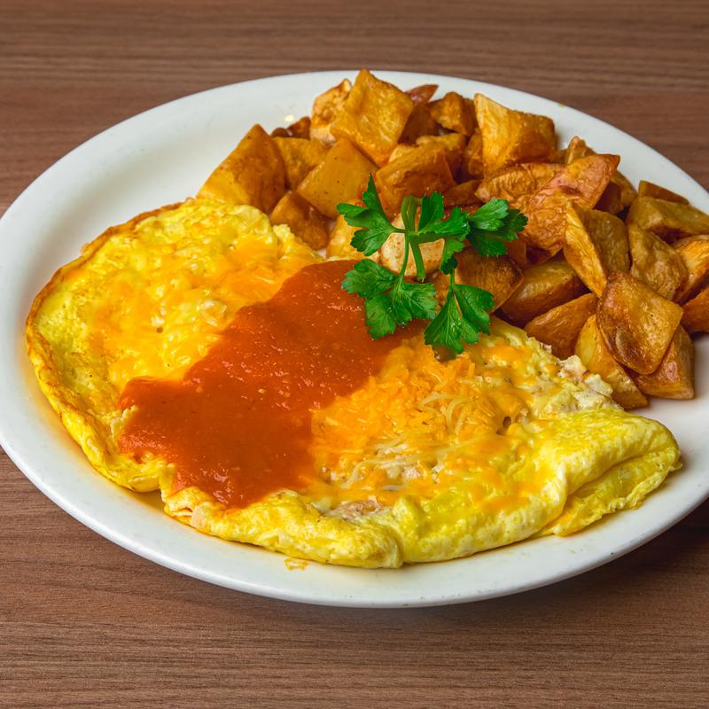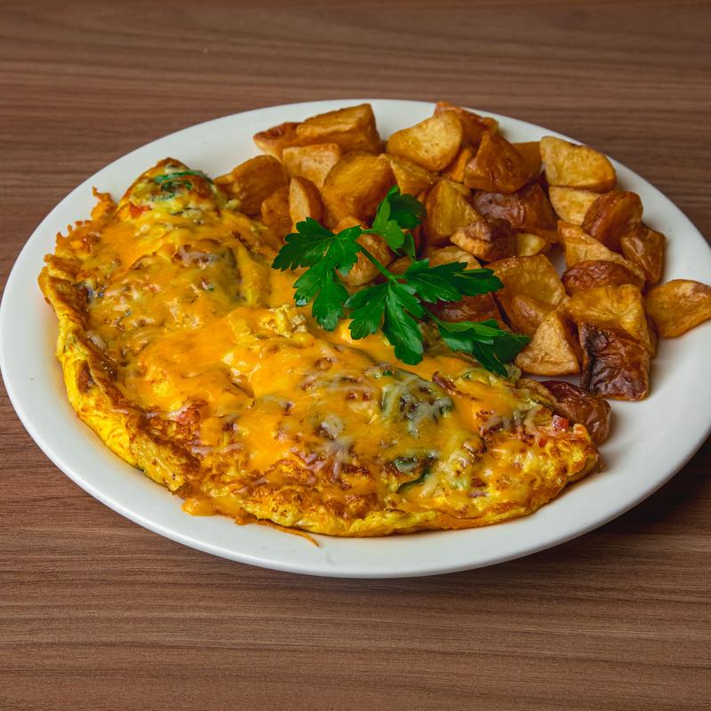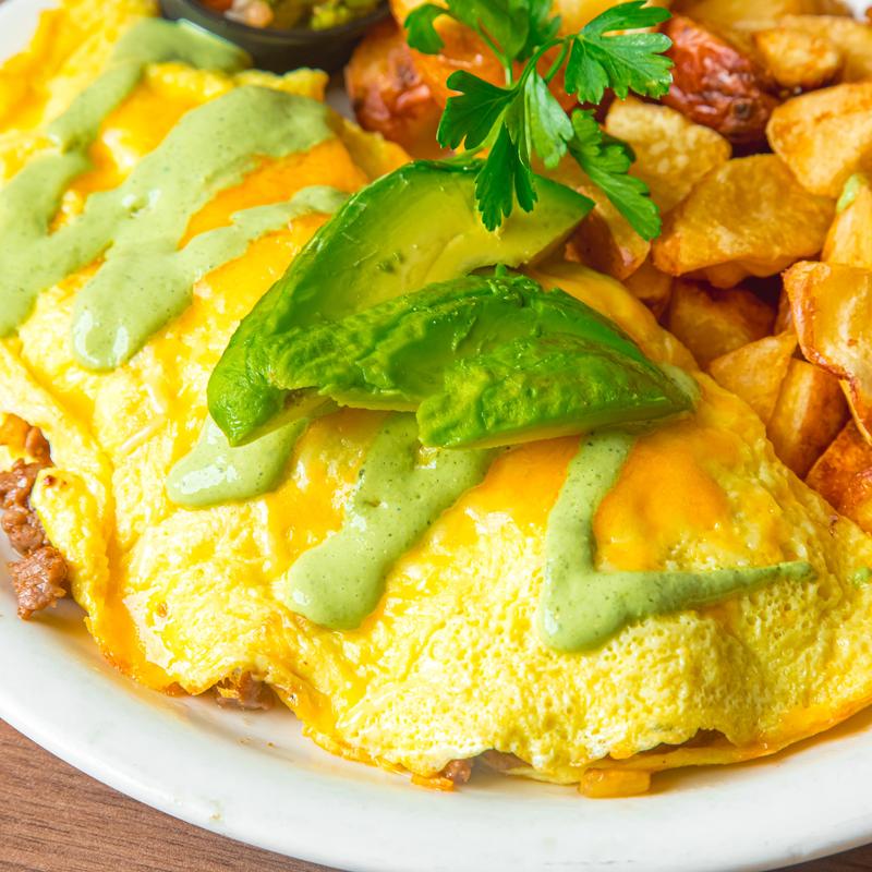Three eggs & cheddar jack cheese. Add (mushrooms, spinach, tomatoes, bell pepper, onion, jalapeño, or sour cream +$0.75 each) • Add (avocado, turkey, chicken, Portuguese sausage, bacon, or ham +$1.25 each)