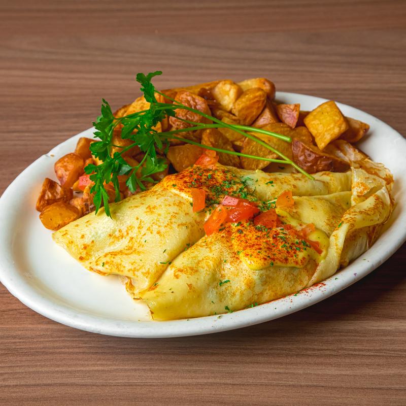 2 crepes filled with Swiss cheese, scrambled eggs, spinach, mushrooms, green peppers, onions, topped with hollandaise sauce & fresh diced tomatoes. Served with salad.