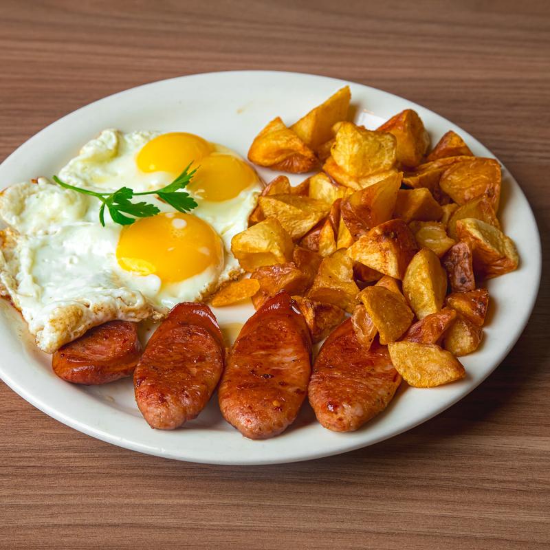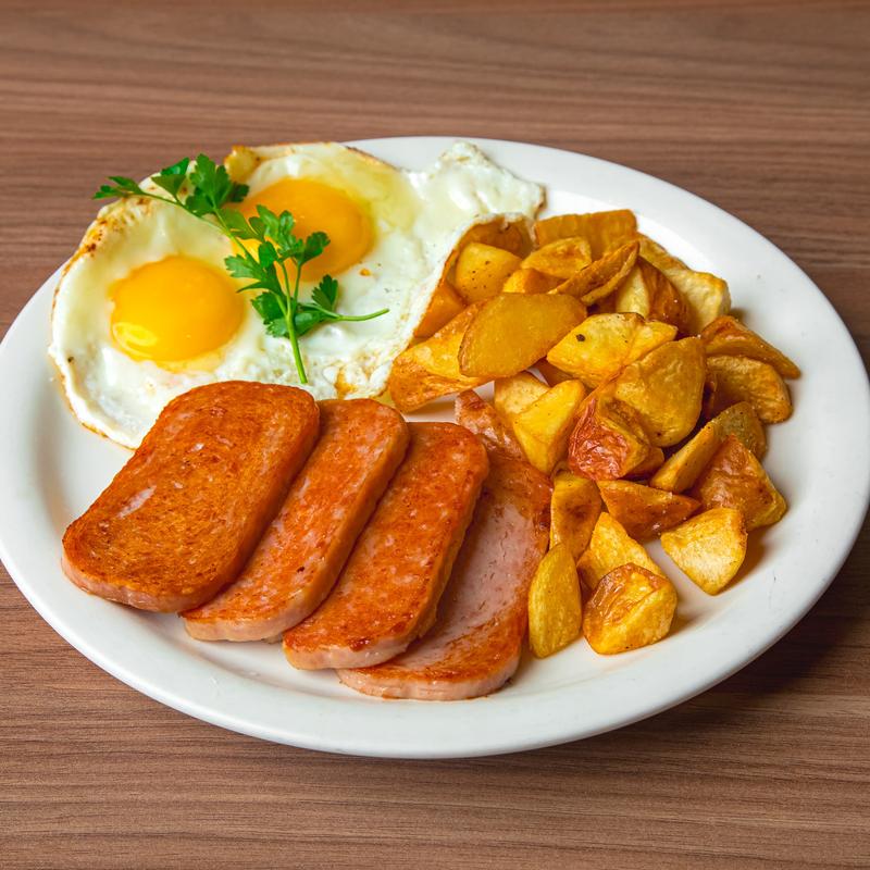 One choice of bacon, Portuguese sausage, spam, corned beef hash, or chorizo, eggs, cheddar jack cheese & potatoes.