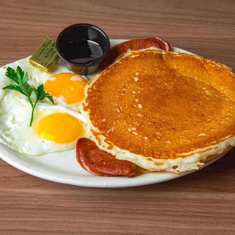 2 pancakes, 2 eggs, and one choice of 2 bacon, 2 Portuguese sausage, or 2 spam.
