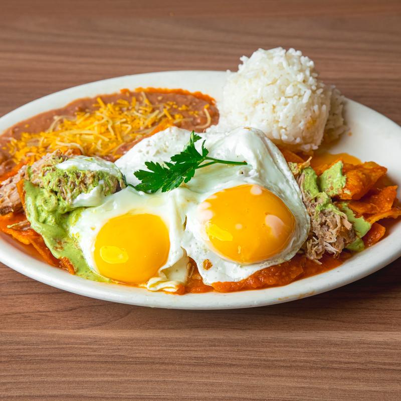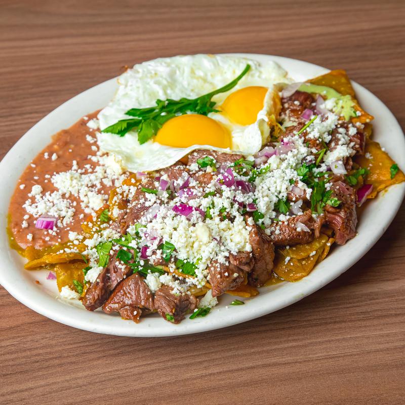 Tortilla chips sauteed with steak and housemade salsa verde sauce. Served with two eggs, refried beans. Topped with sour cream, queso fresco, cilantro, and red onions.
