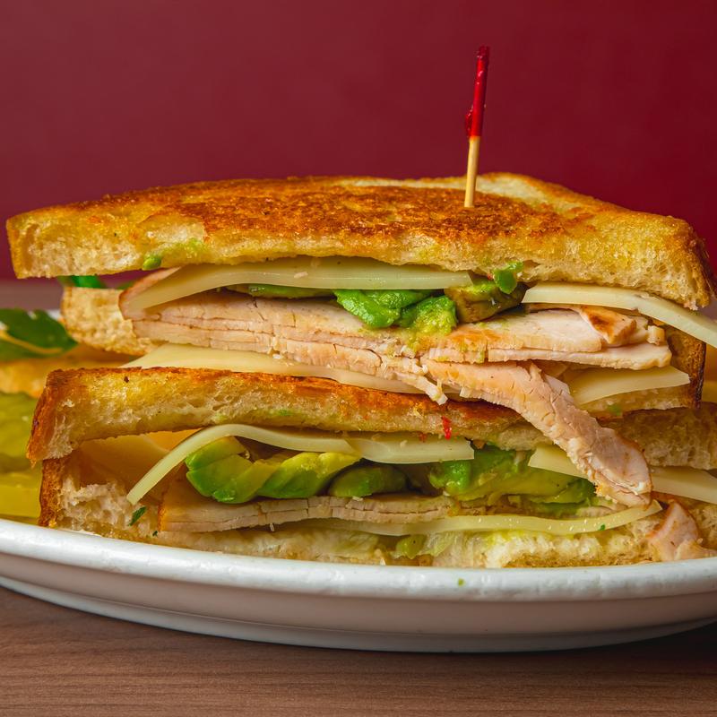 Turkey breast, Swiss cheese & avocado on grilled parmesan-crusted sourdough bread.