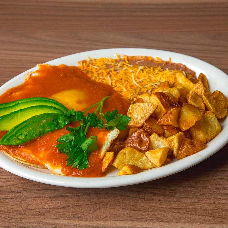2 eggs on top of fried corn tortillas, chipotle ranchero sauce, avocado, home-fried potatoes, refried beans with cheddar jack cheese.